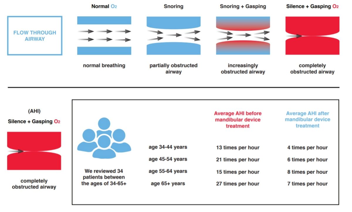 Oral appliance therapy is a device system worn in the mouth, during sleep. The device design is scanned, custom made and fits similar to a more precise sports mouth guard or orthodontic retainer, preventing the airway from collapsing. The device supports the tongue or/or jaw in a forward position, thereby opening the airway.
